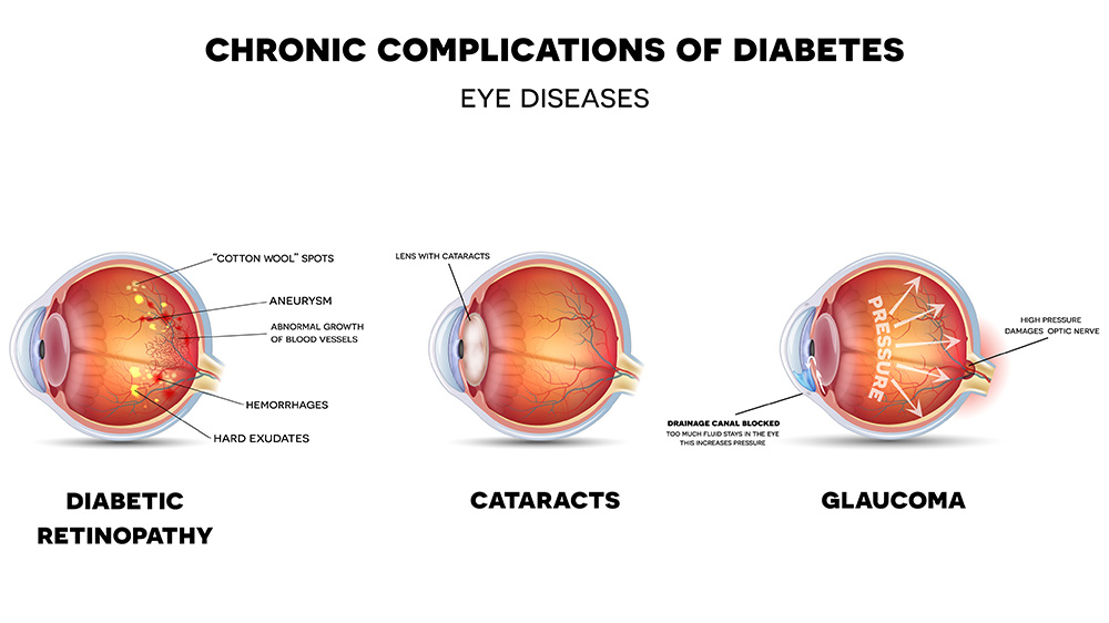 The treatment depends upon the condition. For instance, you may receive a prescription for eye drops or an oral medication to reduce the pressure in your eye if you have glaucoma. Patients with cataracts may need frequent changes in their eyewear prescription to combat the problem. Surgery may be necessary for the advanced stages of either cataracts or glaucoma. For diabetic retinopathy, laser surgery may be necessary to remove vessels or treat abnormal ones.